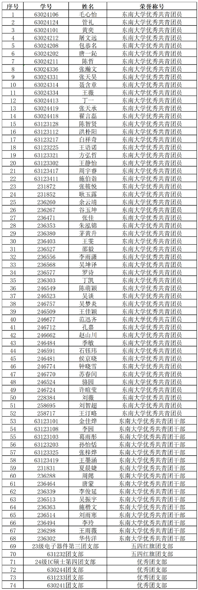 根据《关于开展bw·西汉姆联2024年度“两红”“两优”评选表彰工作的通知》,坚持“公平、公正、公开”的原则,经个人申请、各团支部提名申报、各团支部评议审核、学院团委组织评审,优秀团员、优秀共青团干部、优秀团支部、五四红旗团支部拟推荐名单如下,现进行公示,公示期2025年4月18日-4月20日,如有异议,请发送邮件至103009296@seu.edu.cn。